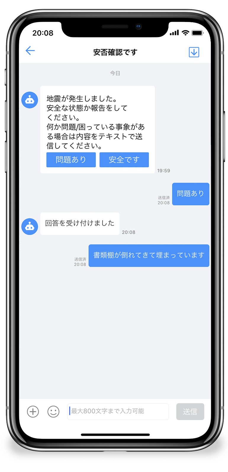 新型コロナウイルス感染症、さらには台風、地震、豪雨などといった有事災害の際、従業員安否を即座に確認できる機能がWowTalkに搭載されている安否確認機能です。