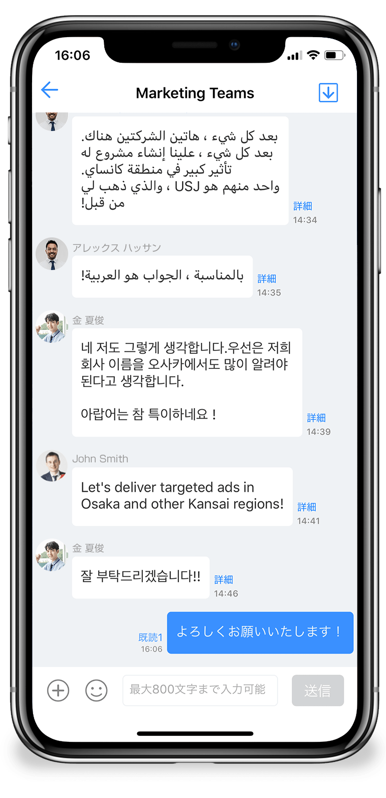 WowTalkの翻訳機能は、英語、中国語、韓国語をはじめ、22ヵ国語の翻訳に対応。トーク毎の翻訳はもちろん、設定により母国語でトークをすると自動で相手の言語に合わせて自動翻訳設定も可能です。さらに詳しく見る >
